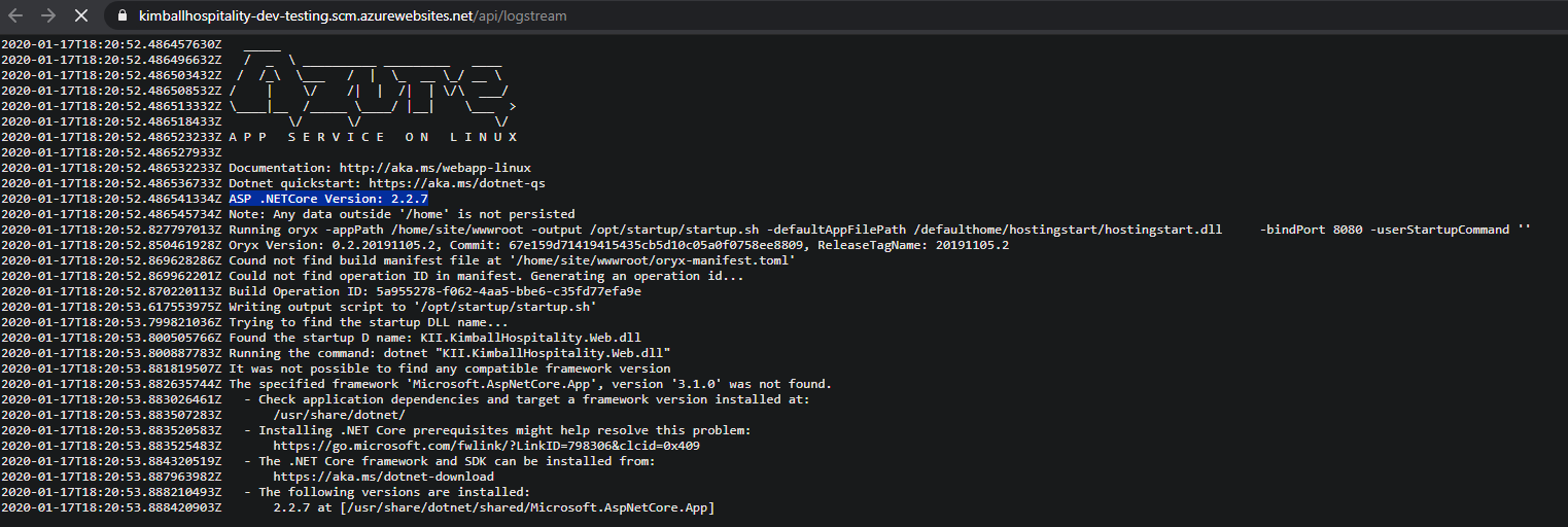 在Azure中将.Net Core2.2LinuxWebApp升级到.Net Core3.1之后,应用程序出现了Specified framework 'Microsoft.AspNetCore.App', version '3.1.0' was not found
