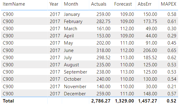 'MAPEX‘列中的总数实际上是'AbsErr’/ 'Actuals‘列中总数的总和:(1457.27 / 2786.27 = 0.52)。