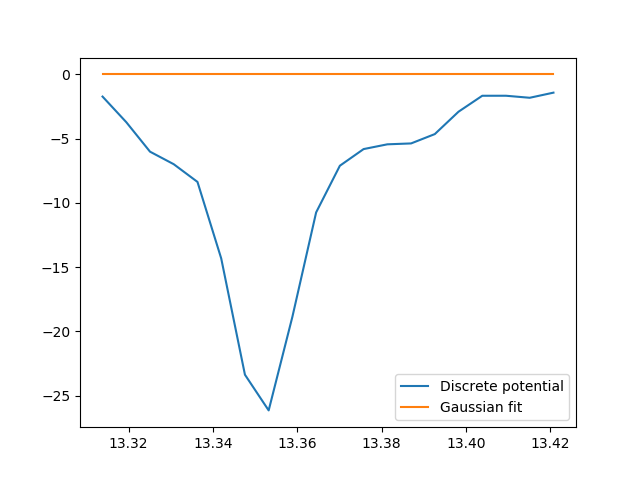 我试图用astropy.modeling软件包来拟合高斯到离散势。虽然我给高斯分配了一个负振幅,但是它返回一个零的高斯,也就是说,到处都是零振幅: