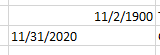 如果在Excel中无法识别日期,下面的公式将返回FALSE,例如,11/31/2020被确认为文本。