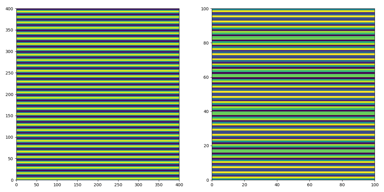 编辑:在下面的示例中,我绘制了一个正弦函数(白色/黑色条纹)。在左边,信号被正确地采样,在右边,它被欠采样到4倍。它是相同的信号,但是由于像素更大(更小的采样),你会得到你的数据的混叠。这里的条纹是水平的,但垂直条纹的效果也是一样的。
