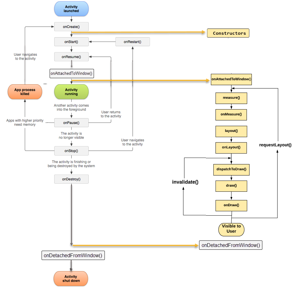 这里不是一个100%的官方图表,我是从正式的活动生命周期图和视图生命周期中混合而来的,因为我在安卓文档中没有看到任何关于视图生命周期的图表(如果我们可以称之为生命周期)。