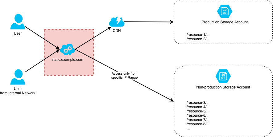 目标是拥有一个地址(static.example.com)来访问具有动态访问控制(基于IP范围)的多个存储帐户的静态资源。