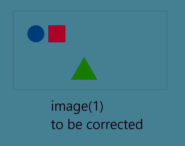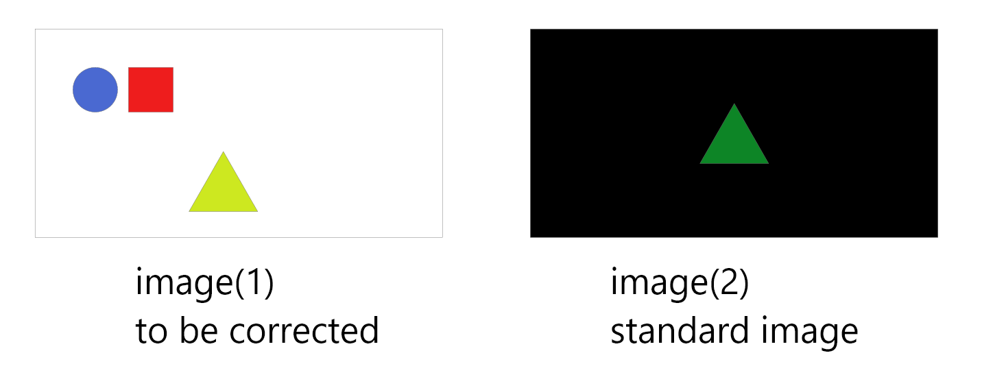 image1是要校正的图像,image2是在黑匣子中拍摄的标准图像。两个图像中都有一个三角形,颜色略有不同,我想通过基于image2的三角形来校正image2,这样image1中的圆圈和正方形也可以被校正。