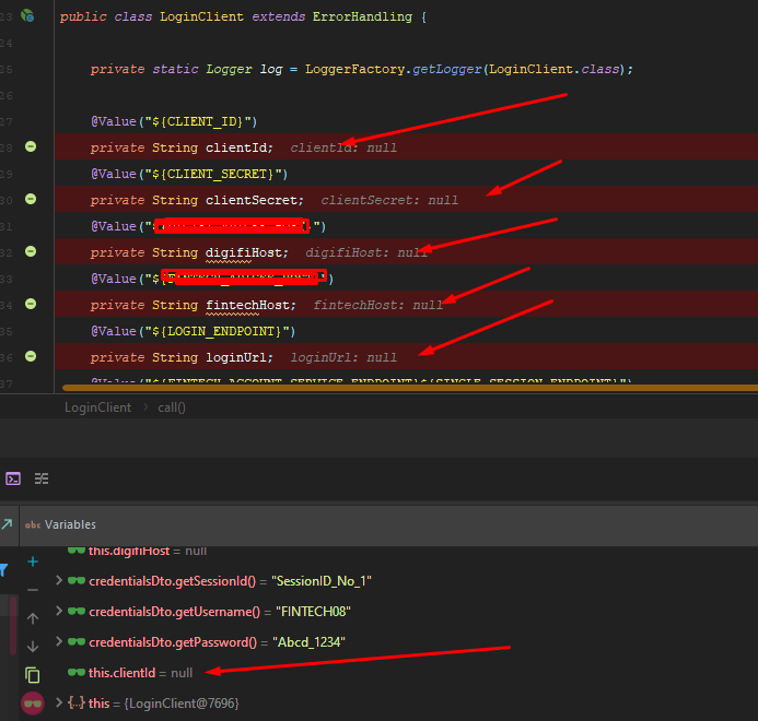 So from Java Class > application.properties file/config > Runtime Environment Variables 下面是调试测试时带有空值的变量的屏幕截图。正如您所看到的,所有的值都是null,这意味着它没有加载我在Unit Test中放置的环境变量。在另一个测试用例中,我有一个临时修复(正如我在这里输入的答案),它们被填充,因此正确地加载环境变量,但是在我的许多其他测试用例中,比如这个,它没有。