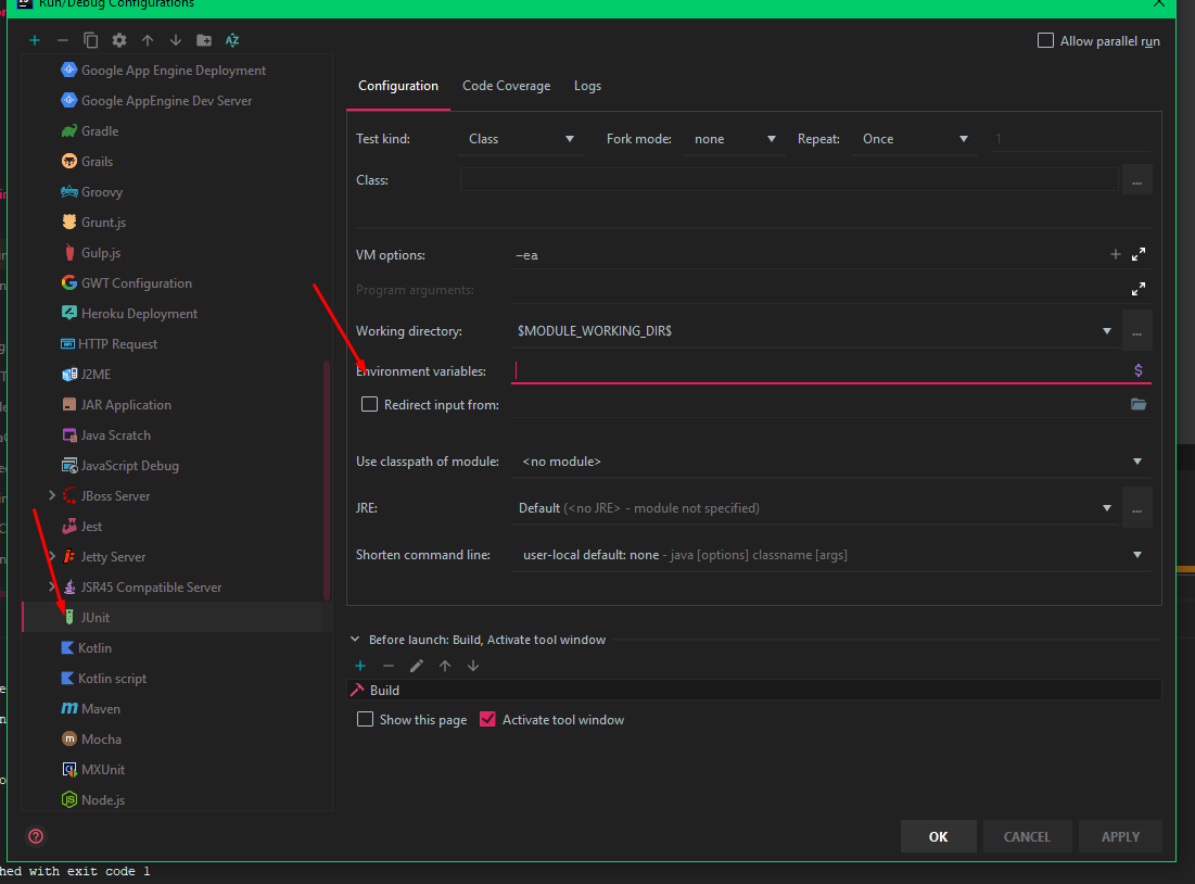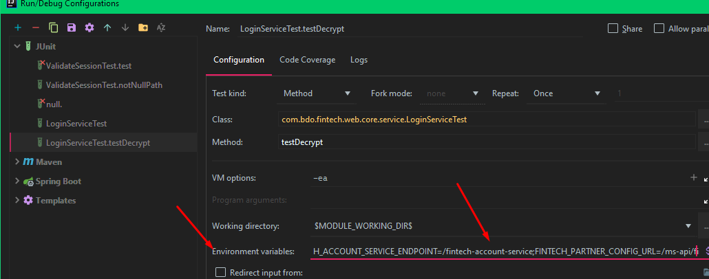 我试图创建一个单元测试,但是,每当我运行它时,我都会在变量上遇到null值。调试该问题时,指向我的环境变量在单元测试中未被全局使用。作为一个class,我正在测试调用另一个类,该类然后从一个环境变量引用它的值。如何在IntelliJ中使用全局环境变量?