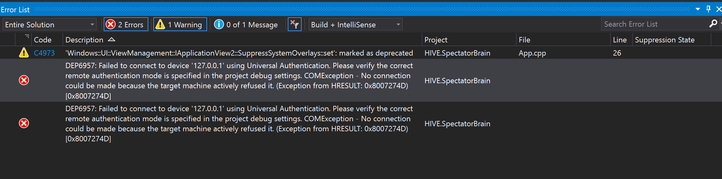 一直试图通过USB将我的一个项目部署到Microsoft HoloLens 1上。由于某些原因,我一直收到有关远程身份验证的错误:"DEP6957:使用通用身份验证连接到设备'127.0.0.1‘失败。请验证正确的远程身份验证模式……等等。“