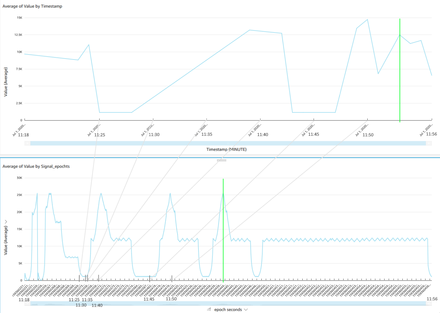 也许这并不奇怪,它们看起来完全不同。第一种是线性标度,正如QuickSight所理解的那样。第二个没有线性尺度,而是按升序顺序列出了时代的时间。由于在时间周期结束时有更多的数据点,所以您将得到一个高度偏斜的时间序列视图。数据的任何一个视图都不能为客户所接受。但除了使用不同的BI工具之外,我还能做什么呢?