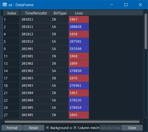 我想要创建一个新的列,它是每个BillType列中“in”和“SA”的生命之和。这样,我将有一个‘生命总’条目的单一TimePeriodId。我已经看过了很多文档,也不知道在这种情况下我会怎样做。