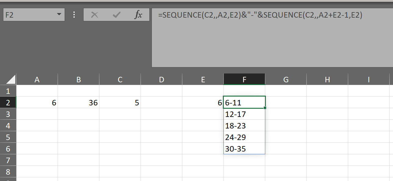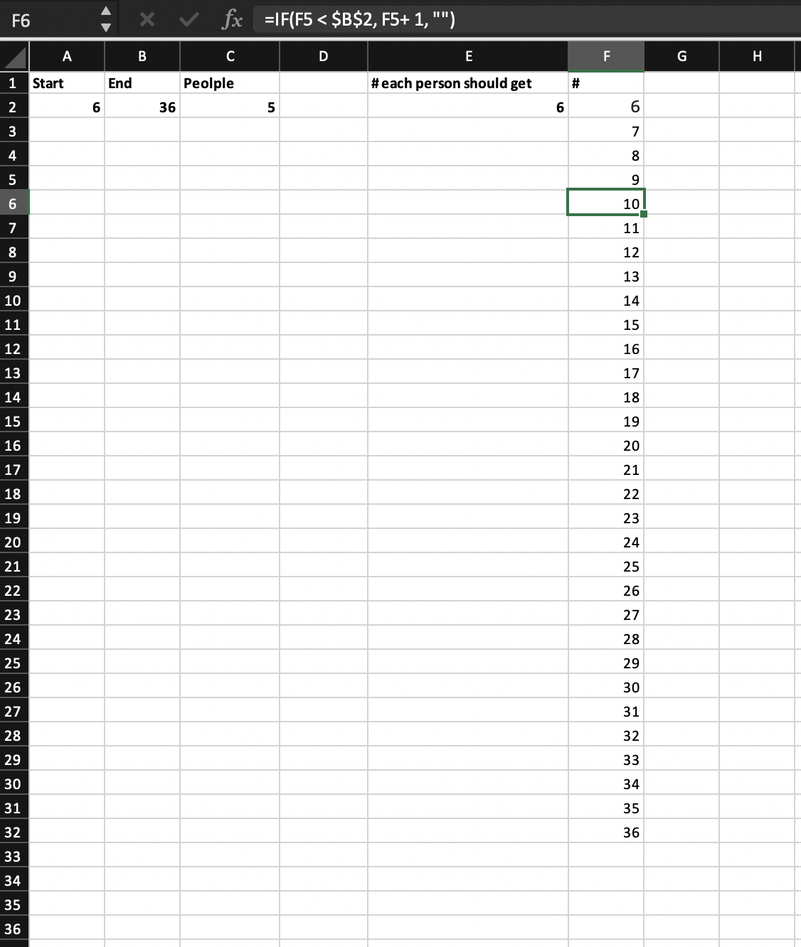 所以我需要excel把一个数字列表变成一个包含这些数字的范围列表。在图像中,我需要它,以便将数字6-36 (开始,结束)的列表按6分组(每个人得到的数量),所以它是6-11,12-17,等等,直到达到36。这些价值观是可以改变的。我不确定是否可能,但我很感激能得到的一切帮助。