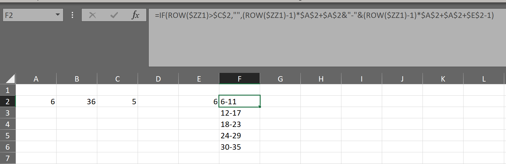 =IF(ROW($ZZ1)>$C$2,"",(ROW($ZZ1)-1)*$A$2+$A$2&"-"&(ROW($ZZ1)-1)*$A$2+$A$2+$E$2-1)