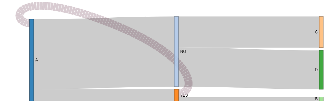 df <- data.frame(PROD = c("A","A","A","A"), REJECT = c("YES","YES","NO","NO"),ALT_PROD = c("A","B","C","D"), VALUE = c(100,50,400,500))我希望根据上面的值绘制一个3节的sankey图。我发现的大多数示例都使用了2节图(从->到),但我希望包括中间部分“拒绝”。我还找到了包含多个部分的示例,但由于我在R.