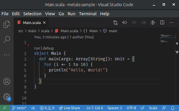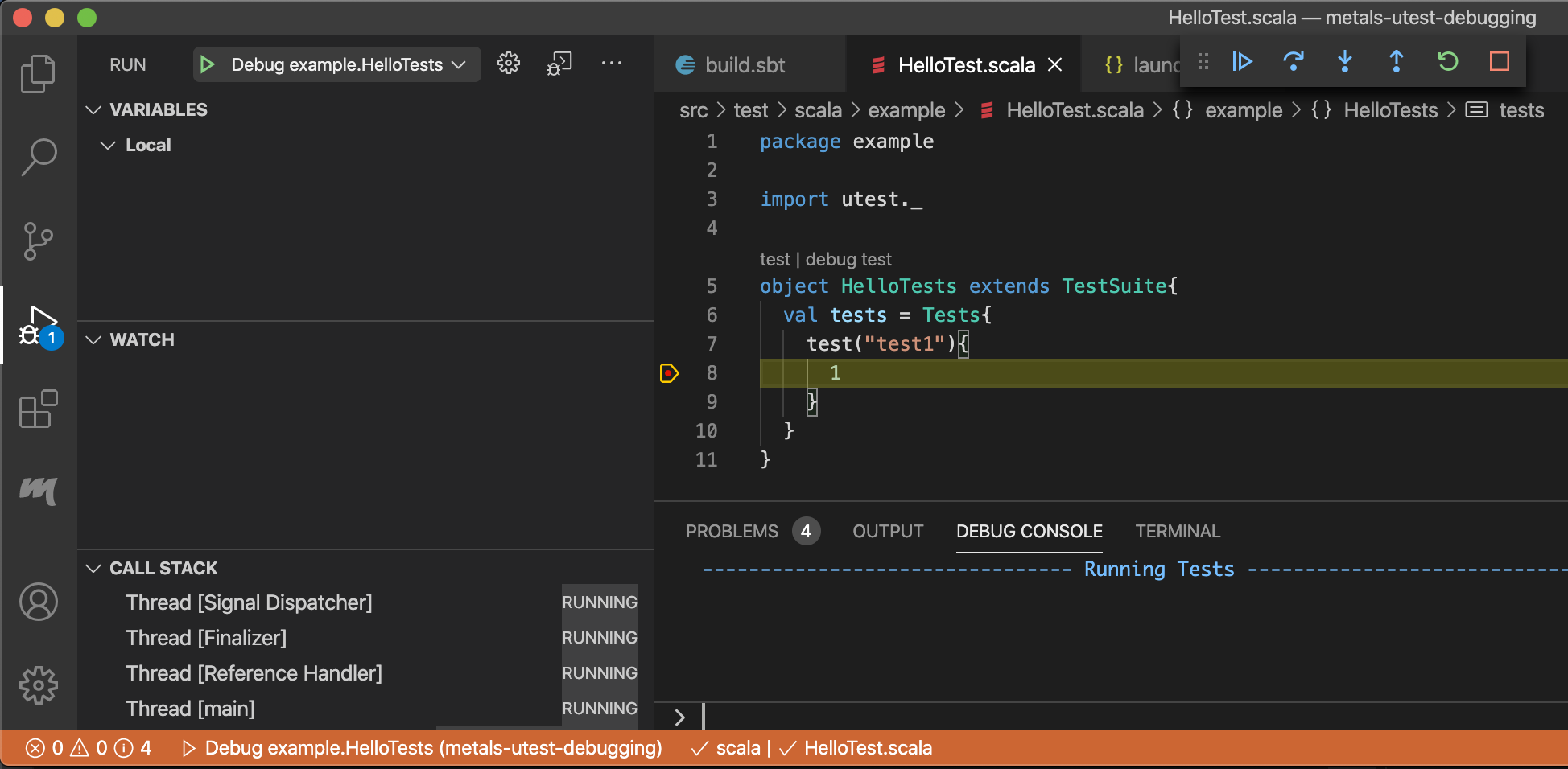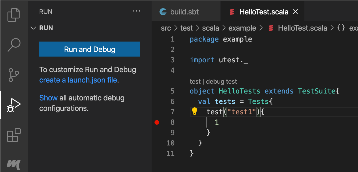 launch.json配置下面是一个hello示例,如何通过launch.json方法使用VSC和Metals调试测试。我们将使用lihaoyi/utest库并在测试中设置一个断点。