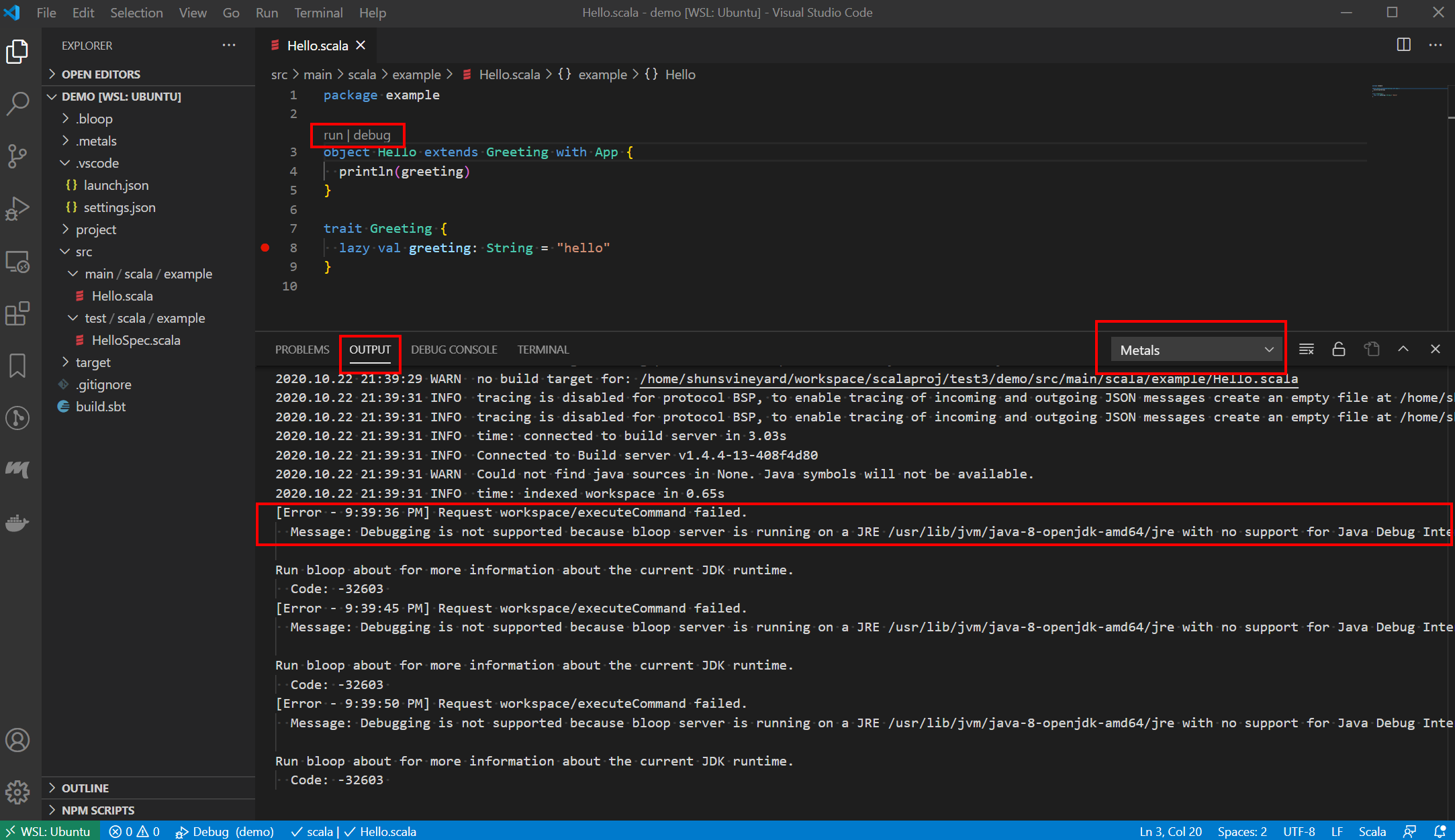 Message: Debugging is not supported because bloop server is running on a JRE /usr/lib/jvm/java-8-openjdk-amd64/jre with no support for Java Debug Interface: 'JDI implementation is not provided by the vendor'. To enable debugging, install a JDK and restart the bloop server.我想你的案子可能是一样的。要解决这个问题,只需安装一个支持JDI的Java实现即可。例如,openjdk version "11.0.8" 2020-07-14可以很好地处理Ubuntu上的Metals。你可以这样做来安装它。