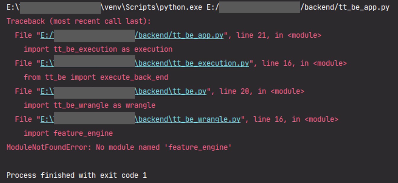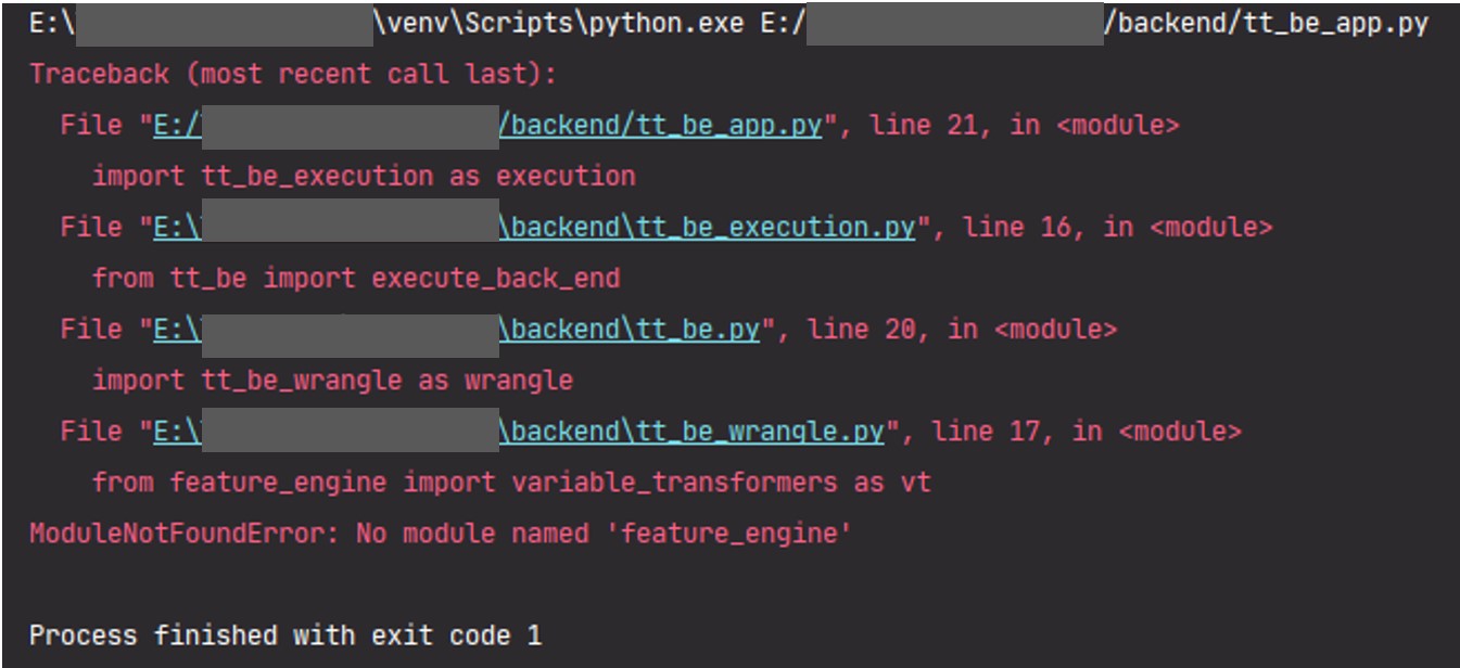 下面是错误跟踪的示例。正在运行的对象是一个Flask应用程序,它导入使用功能引擎库的包。最终导入中的实际导入语句是简单的import feature_engine。使用from feature_engine import variable_transformers as vt直接导入方法的尝试也失败了。