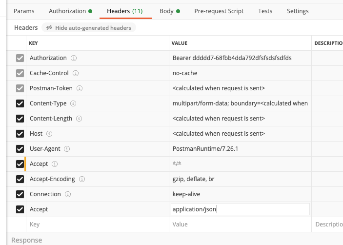 使用/这是邮递员的默认设置,将无法工作。如果你不想在头上中继,你也可以做$request->json(),但我想,你只是想传递标题。