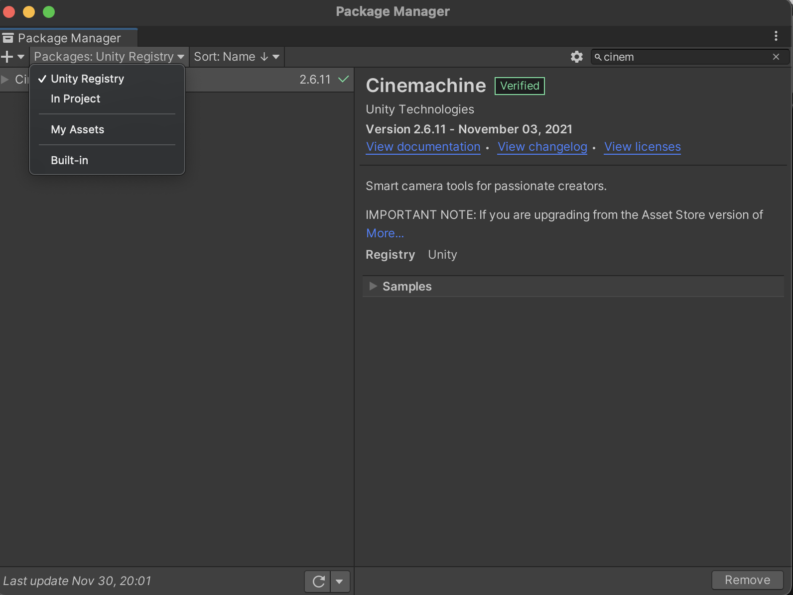 转到Windows >>软件包管理器>> on Package (选择单元注册表) >>搜索"Cinemachine“>>安装和导入