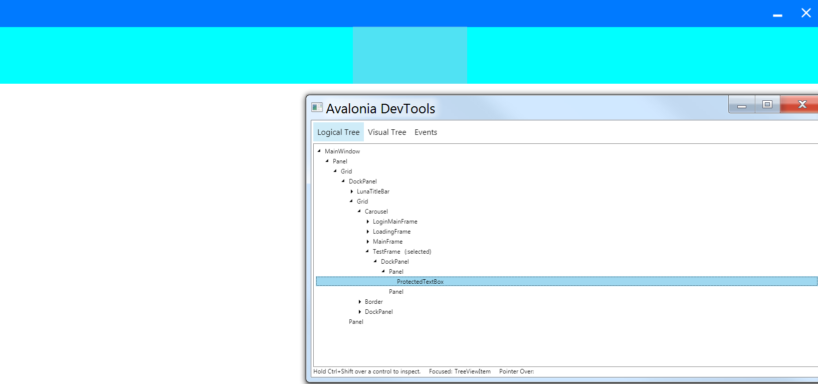 </Frame>然而,它只是无形的,不被渲染。( Avalonia DevTools似乎知道它是存在的,当在LogicalTree中选择它时,应该突出显示我的ProtectedTextBox )。