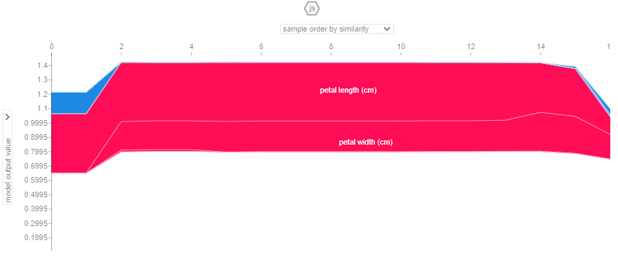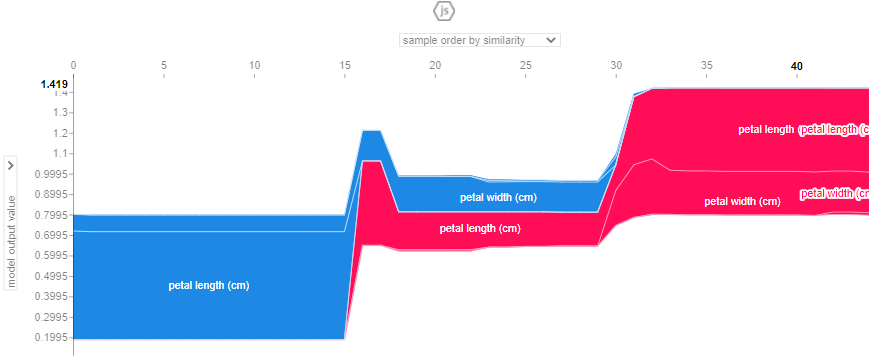 现在,如果我们想对错误分类的样本进行同样的处理,我们需要看看输出概率。由于虹膜数据集有几个类,假设我们希望对本应被归类为force_plot