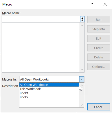 默认情况下,从Developer选项卡打开的宏对话框会列出“所有打开的工作簿”中的所有宏。在显示此选择的下拉列表中,您可以选择仅在特定工作簿中显示宏。这个硬币的反面是,你可以准确地知道任何列出的宏的位置。