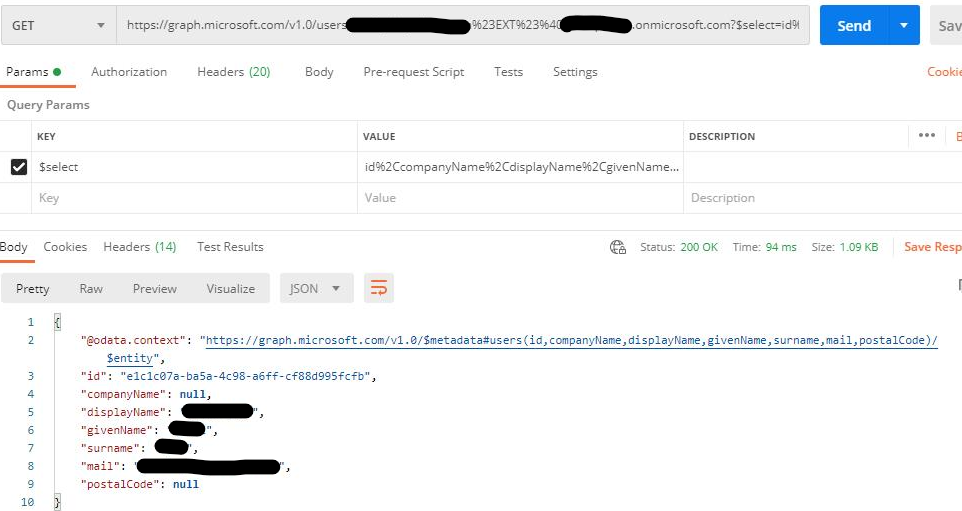 我使用pnp-js来执行查询,但是如果我将HTTP调用导入到Postman并手动执行查询,则会发生同样的情况,因此调用:https://graph.microsoft.com/v1.0/users/first.last_domain.com%23EXT%23%somecompany.onmicrosoft.com?$select=id,companyName,displayName,givenName,surname,mail,postalCode