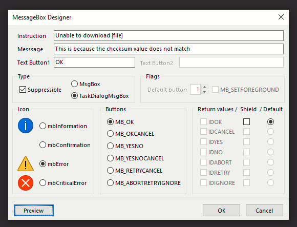 'Unable to download', Msg, mbError, MB_OK, ['OK'], 0, IDOK);