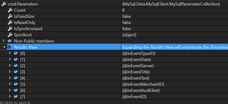 我在IIS/Windows上使用MySql.Data版本8.0.22尝试连接到MariaDB 10.4.12 (Linux)。我试图使用MySqlCommandBuilder.DeriveParameters获取参数信息: