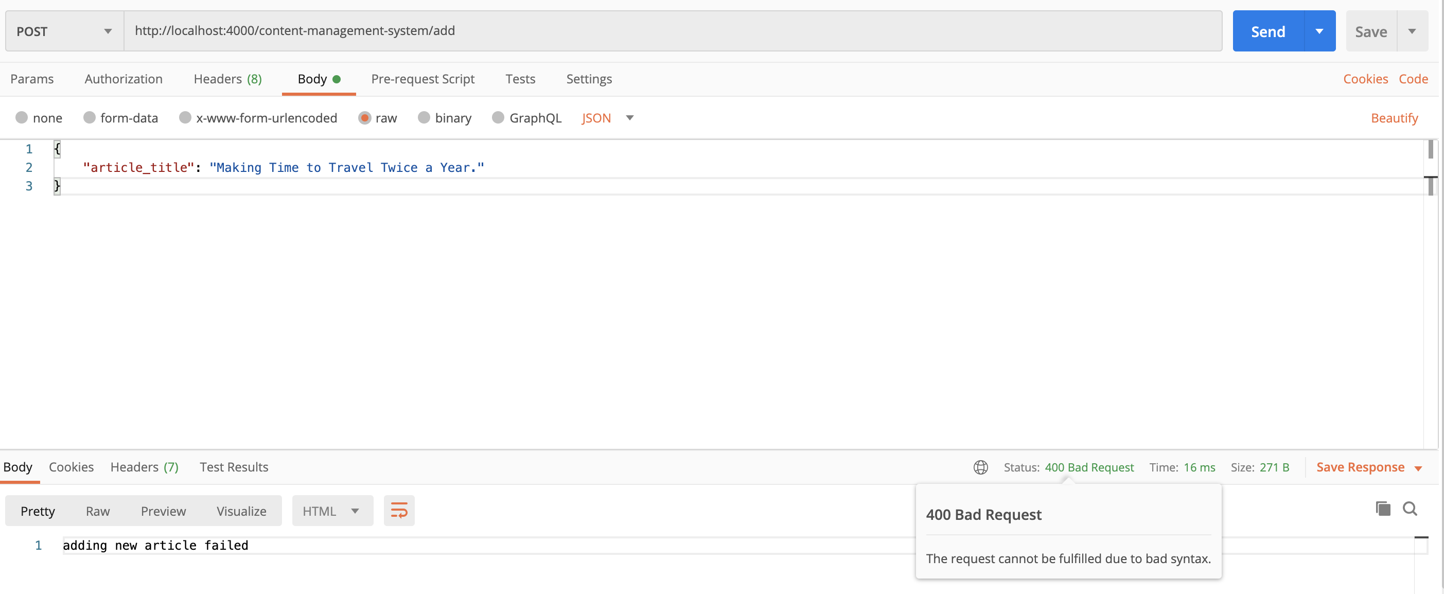 故事的寓意:在邮递员上显示的"400坏请求“错误可能有误导性,问题可能不在于您作为请求传入的JSON主体的语法。