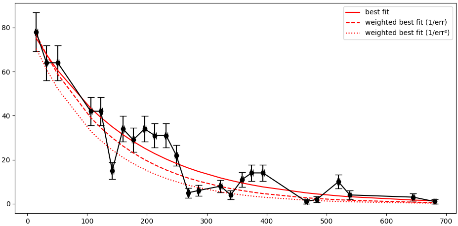 print(decayresult.fit_report())但我认为这并没有考虑到不确定性,只是在图表上绘制了它们。我希望它拟合指数衰减曲线,考虑了不确定因素,返回半衰期(在这种情况下t),并用它们各自的不确定性来降低chi^2。
