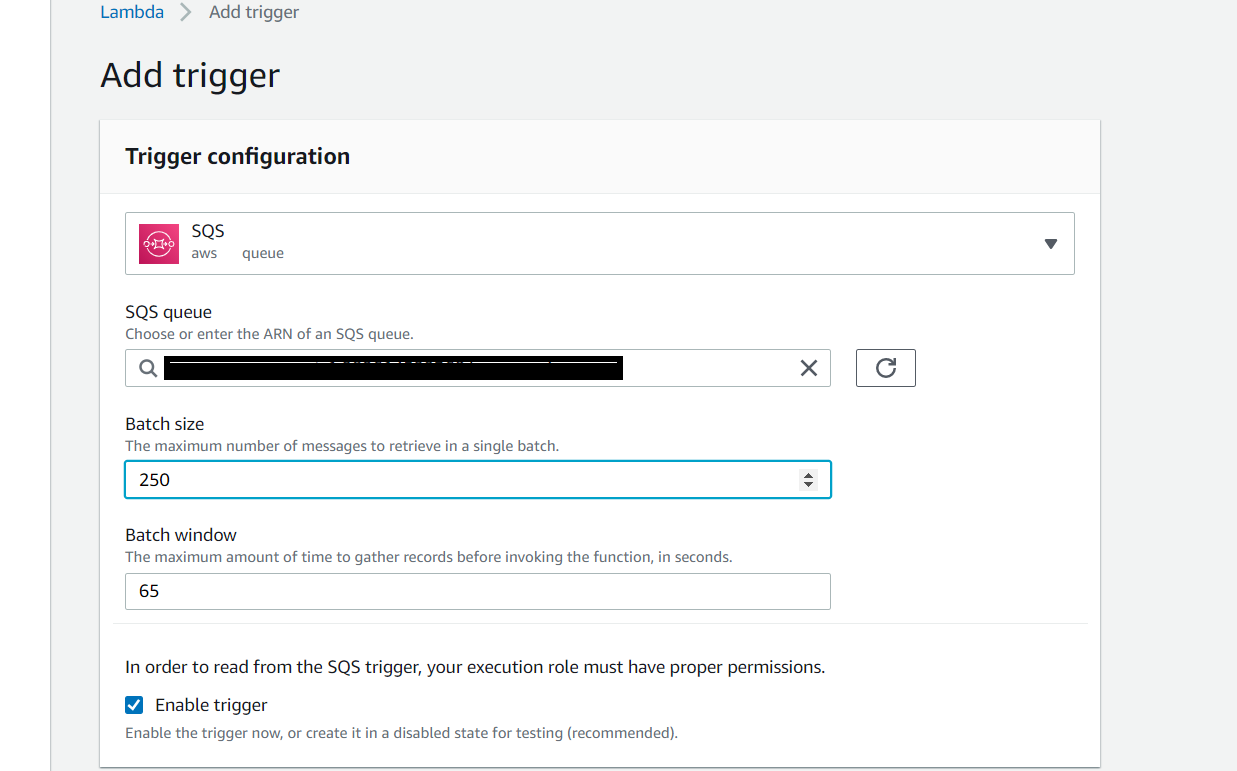我有两个Lambda函数和一个SQS队列。第一个Lambda将消息发送到队列。然后,第二个Lambda为这个队列设置了一个触发器,批处理大小为250,批处理窗口为65秒。