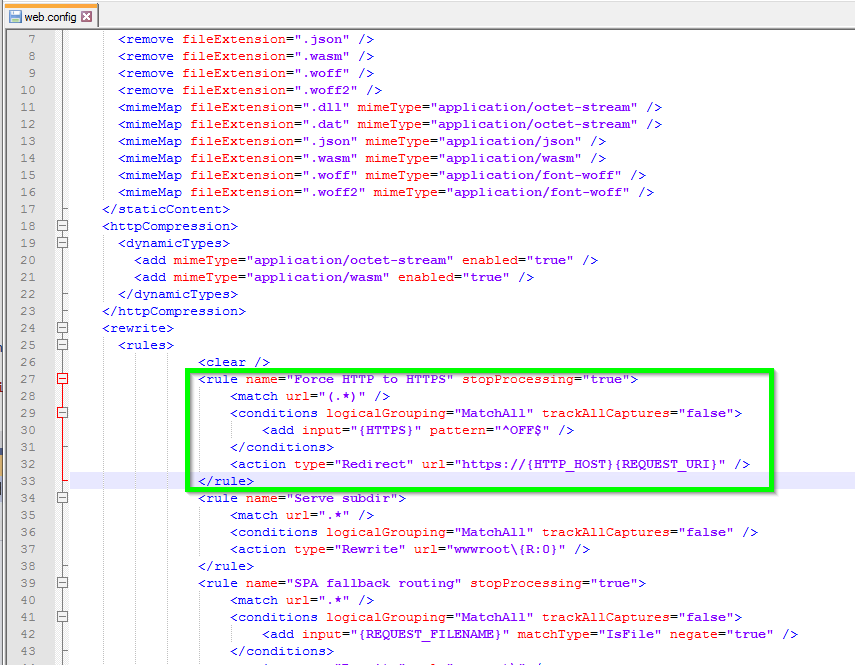 对于其他非WASM站点,我将在IIS配置中这样做,使用"URL重写“将任何此类调用重定向到https等效。这些规则直接存储在web文件夹中的web.config文件中。