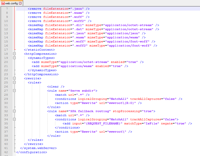 但是,当向IIS发布WebAssembly应用程序时,Visual会创建自己的web.config文件,其中包含正确运行/路由所需的其他url重写规则: