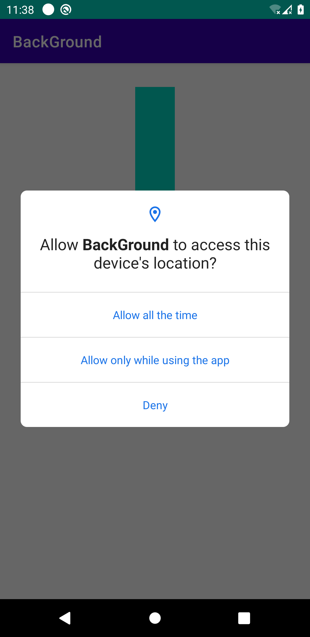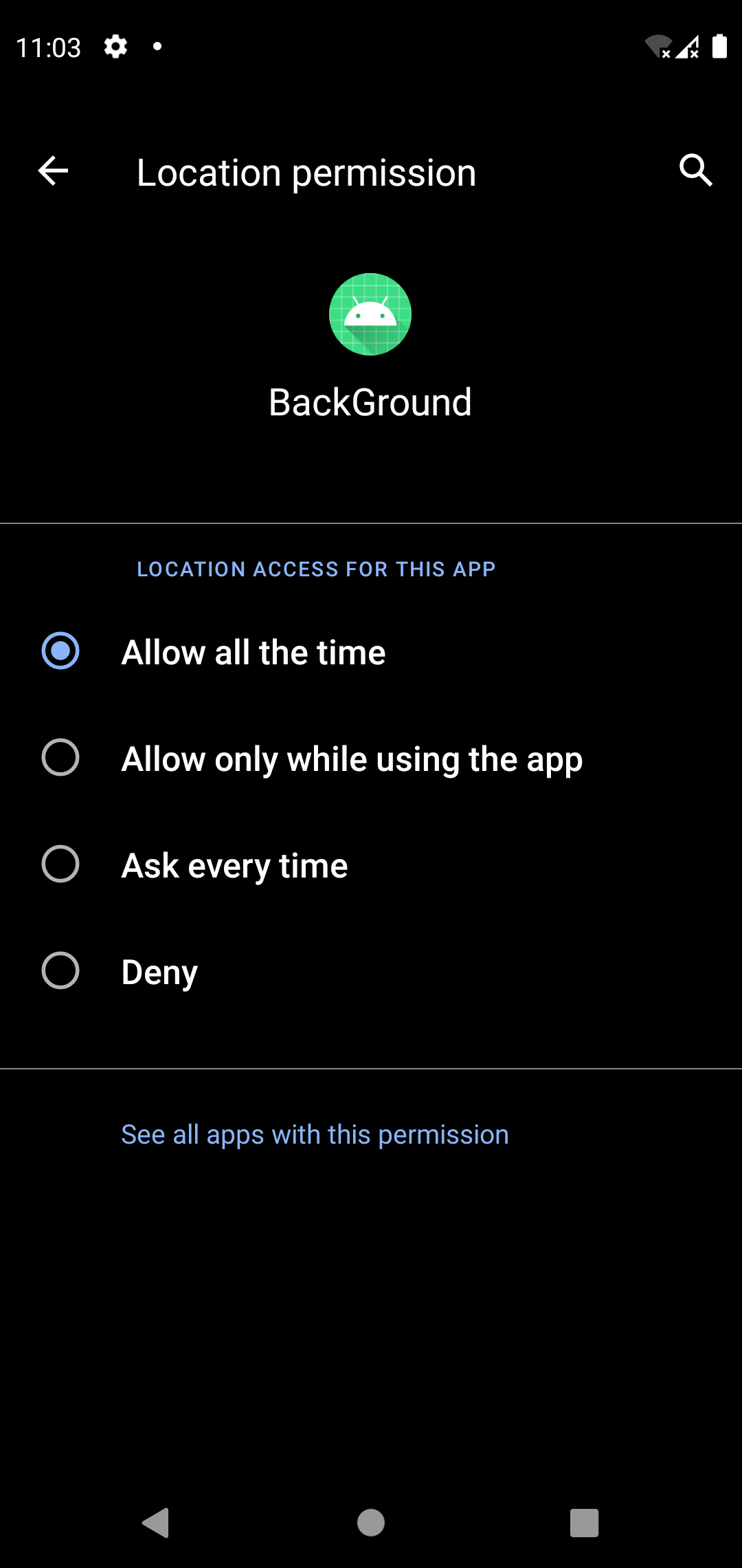 当应用程序中的某个功能请求运行Android 10 (API级别29)的设备上的背景位置时,系统权限对话框包括一个名为Allow的选项。如果用户选择此选项,则应用程序中的功能将获得后台位置访问。 但是,在Android 11 (API级别30)和更高版本上,系统对话框不包括允许所有时间的选项。相反,用户必须在设置页面上启用后台位置,如图3所示。