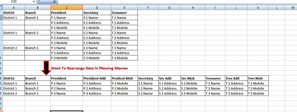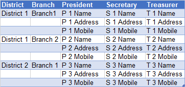 District和District和Branch District的空白行,将President、Secretary和Treasurer.如果您有更多的军官,或者每个军官/职位有更多的项目,或者在进入军官列之前有更多的列,那么修改代码以考虑到这一点应该是相对简单的。