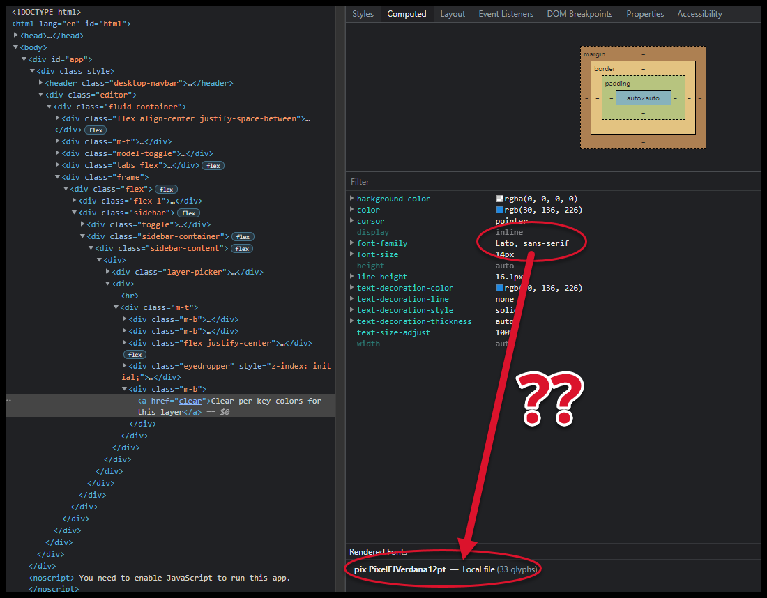 更新2:当前的理论是,我的系统使用的第一个"sans-serif“字体是因为ErgoDox的字体系列的CSS语法错误;”“应该以单引号'括起来,而不是。这导致我的系统返回到它找到的第一个无衬线字体,它通常更有用,比如"Arial",但在我的例子中是pix PixelFJVerdana12pt。我已经安装了"Lato“和"LatoLatin”,它仍然呈现这种可怕的字体。