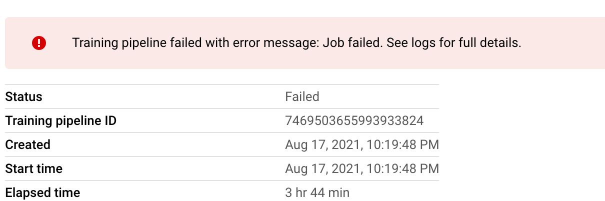 我正在使用顶点AI的AutoML来训练一个模型,它失败了,错误信息显示如下。我在哪里能找到这份工作的日志?
