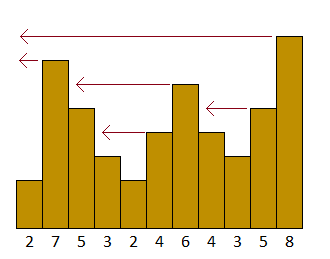 箭头表示较高的杆对其左侧有某种“影响”。你可以想象有人站在酒吧的顶端,朝左边看。或者你可以想到水在这些栅栏之间充满,当它达到当前坝的高度时,你就知道它们的影响范围。当遇到至少有自己高度的条形图时,或者遇到图表的左侧时,它们的影响就停止了。