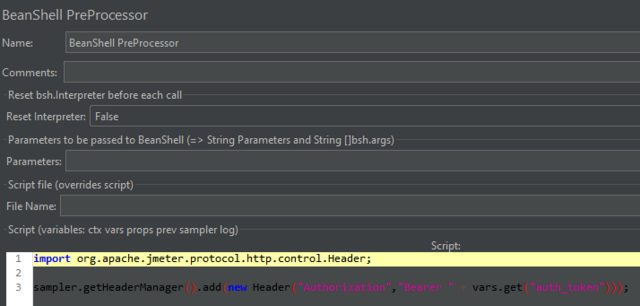 您不需要Beanshell PreProcessor (此外,自JMeter 3.1以来,建议使用JSR223测试元素和JSR223语言编写脚本),仅Header就足够了,假设您的EXTRACTOR Token确实提取了令牌,那么使用调试采样器和查看结果树侦听器组合检查${auth_token}变量值就足够了)
