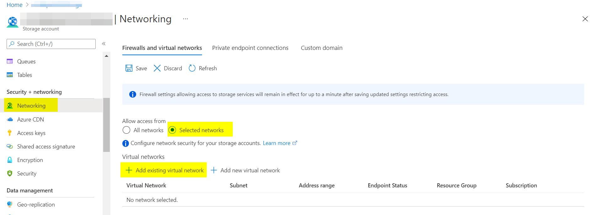 现在转到您的存储帐户-->选择网络->在选定的网络下,单击Add现有虚拟网络->添加您的虚拟网络和子网