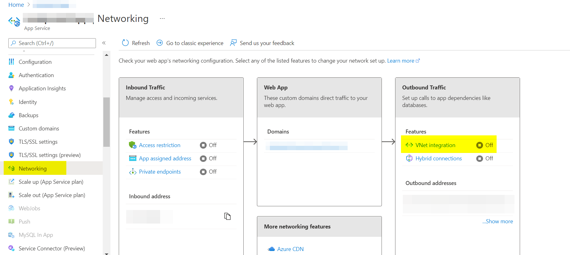 转到门户中的Web应用程序-->选择网络->在出站流量中,选择VNET集成->添加VNET和子网