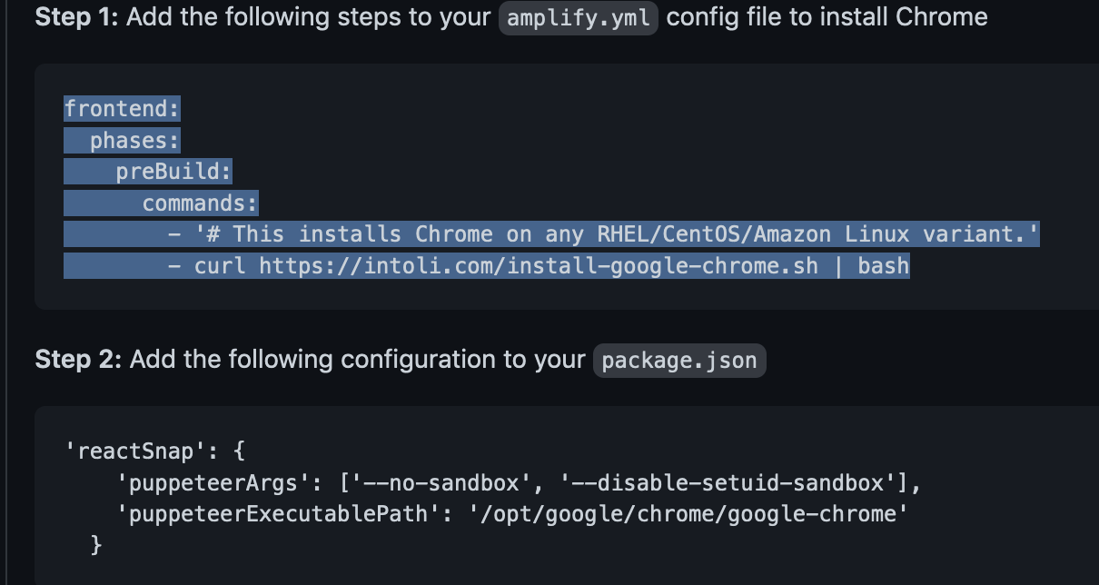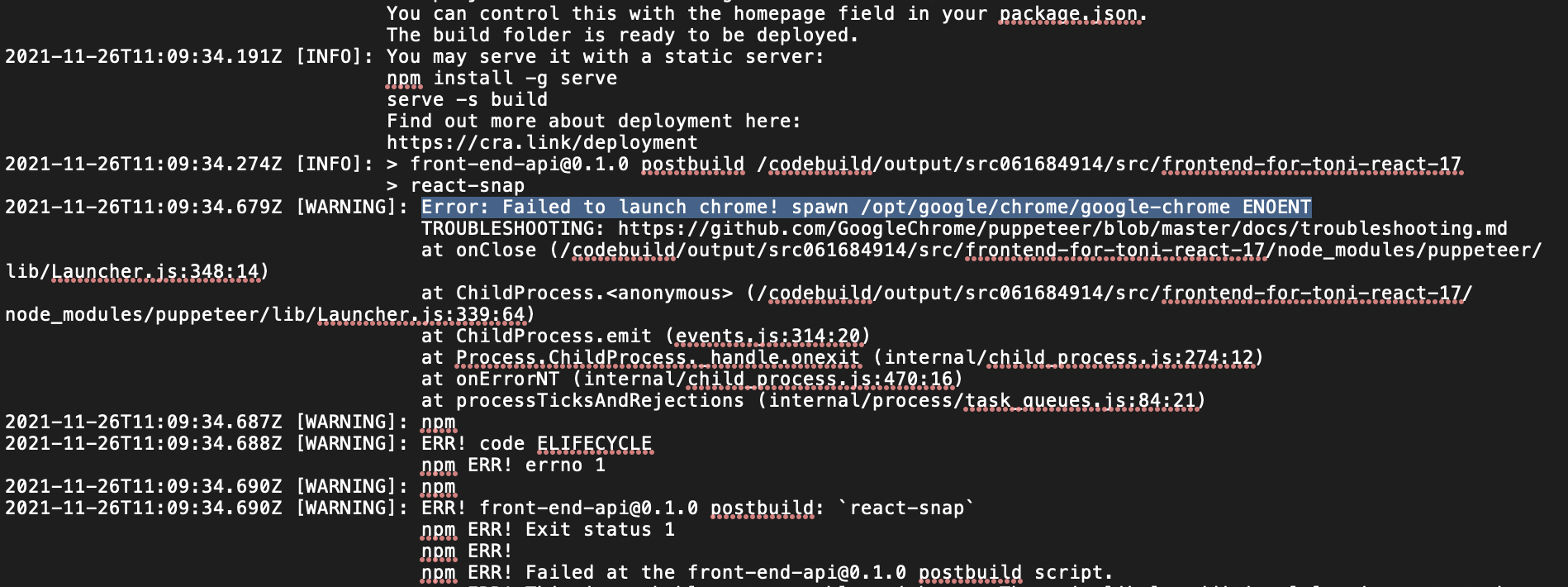 我把我的反应项目推到了,AWS用git放大了。由于SEO的原因,我安装了react snap软件包。当检查扩增控制台时,显示提供步骤成功,但构建步骤失败了。错误日志显示如下:
