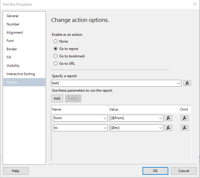 右键单击Textbox > Properties >SelectActionon左侧窗格>选择Go to Report选项,如下所示