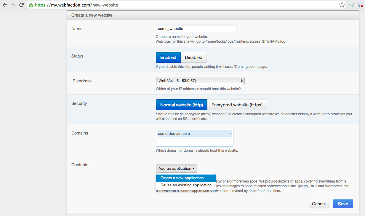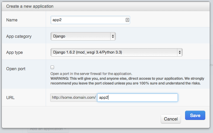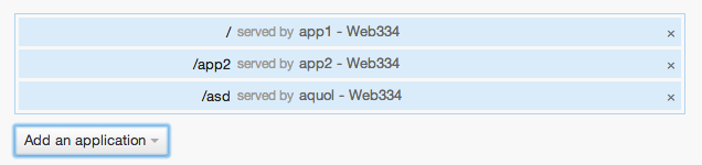 嗯,韦伯让这很容易!在您的控制面板中,转到“网站”,编辑(或创建)网站,在此过程中添加任意数量的新(或现有)应用程序。你可以随心所欲地映射这些应用程序。但是请注意,对于您要添加的第一个应用程序,您没有选择(它将被映射到"/"),但是对于其他应用程序,您可以指定自己的路径。