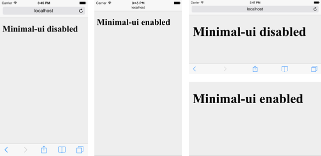 <meta name="viewport" content="width=device-width, minimal-ui">值得注意的是,没有scrollTo黑客那样的最小内容长度要求。对于这种新的模式这里有一个很好的概述。(这就是上面的图像的来源。)他还列举了一些缺点。