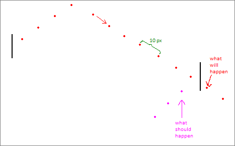 每次你的球跳十个像素,你必须计算每一个位置之间,以确保它不是试图通过一个固体物体,正如你已经看到的会发生。