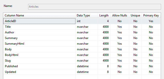 到现在为止还好!但是,我将插入到Body和BodyHtml属性中的数据通常大于NVarChar列类型允许的最大长度,因此我希望EF为这些属性生成Text列。