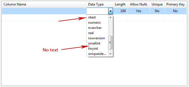 你试过ntext了吗?我刚刚创建了一个SQLCE4.0数据库,当我手动向表中添加列时,我注意到text在数据类型列表中不可用,而ntext是可用的。就像你可以选择nvarchar,但不能选择varchar。