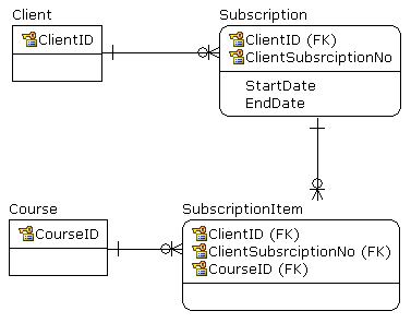 如果需要,可以在该模型上添加其他约束,例如,在(SubscriptionID, CourseID)上Subscription_Course中添加一个唯一的键约束。