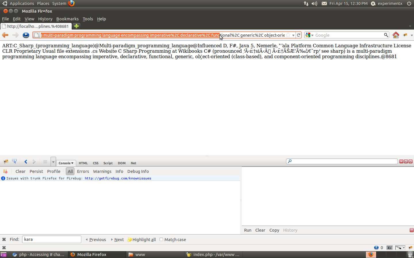 header('Location: http://your_url?version=0.88&value='.urlencode('ART:C_Sharp_%28programming_language%29@Multi-paradigm_programming_language@Influenced D, F#, Java 5, Nemerle, Vala Platform Common Language Infrastructure License CLR Proprietary Usual file extensions .cs Website C Sharp Programming at Wikibooks C# (pronounced /ˈsiː ˈʃɑrp/ see sharp) is a multi-paradigm programming language encompassing imperative, declarative, functional, generic, object-oriented (class-based), and component-oriented programming disciplines.@10902'));在js上你有