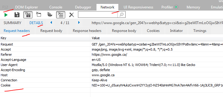 F12->网络选项卡->启用网络捕获流量捕获->详细选项卡->请求标头标签。